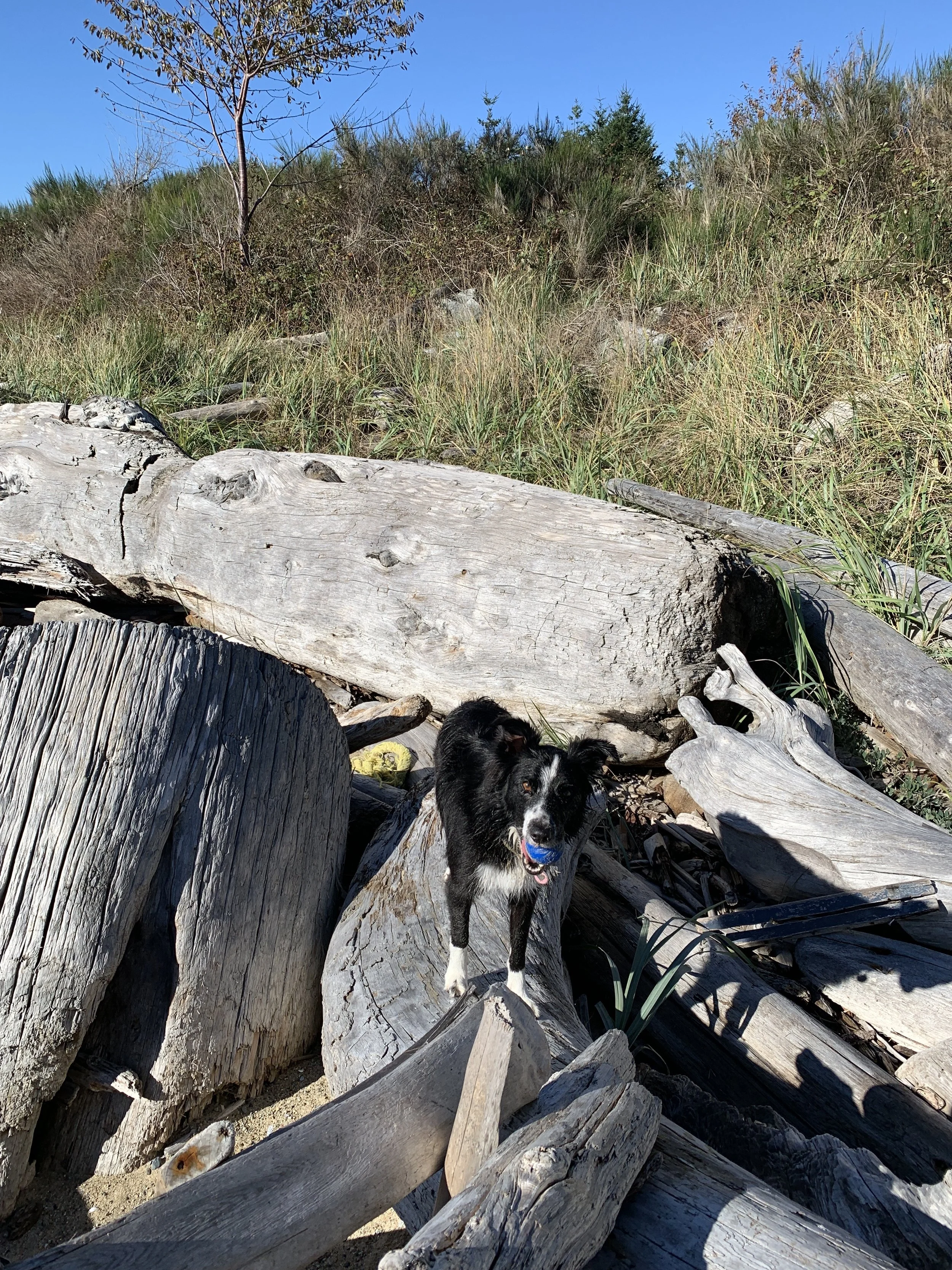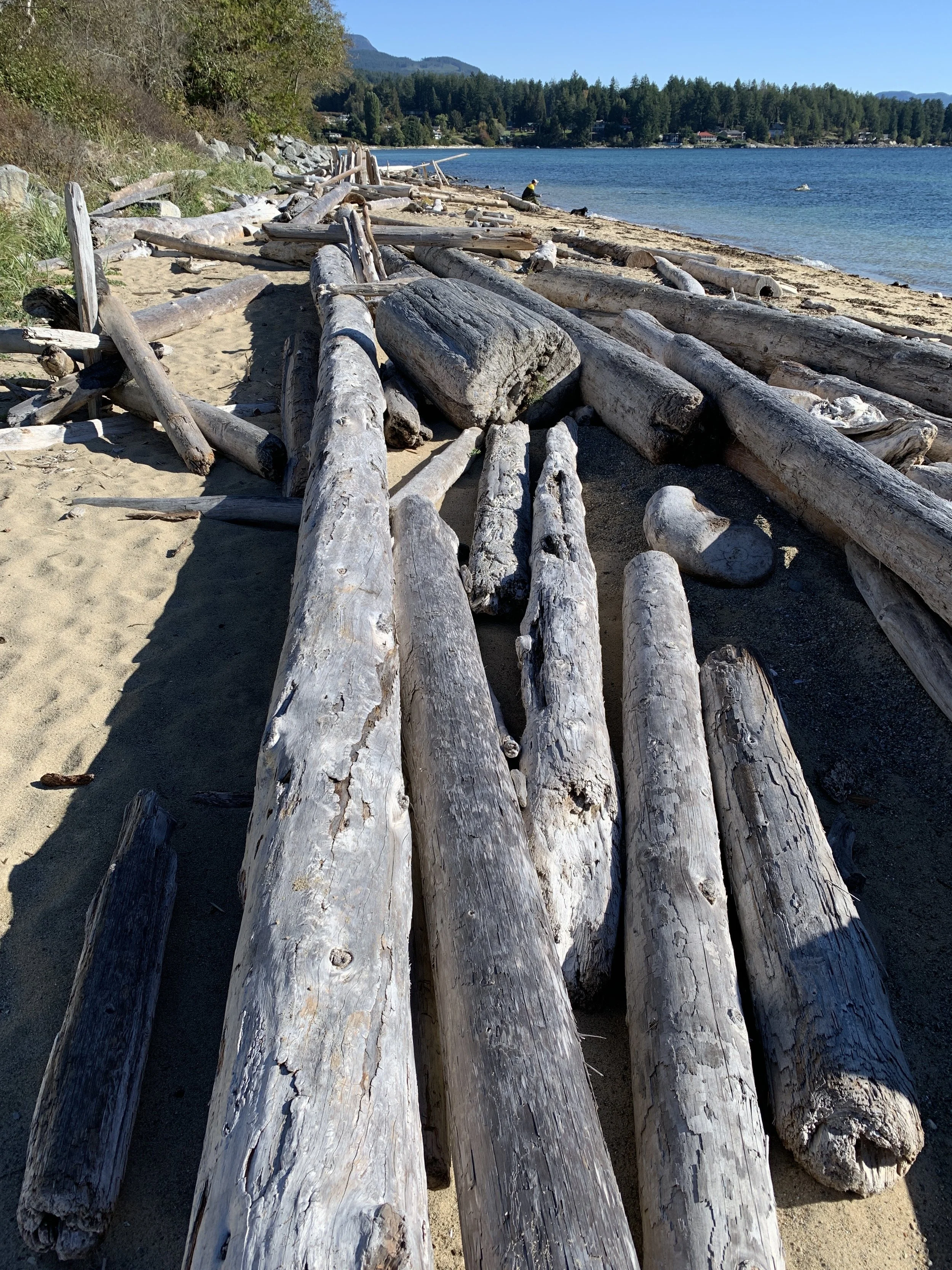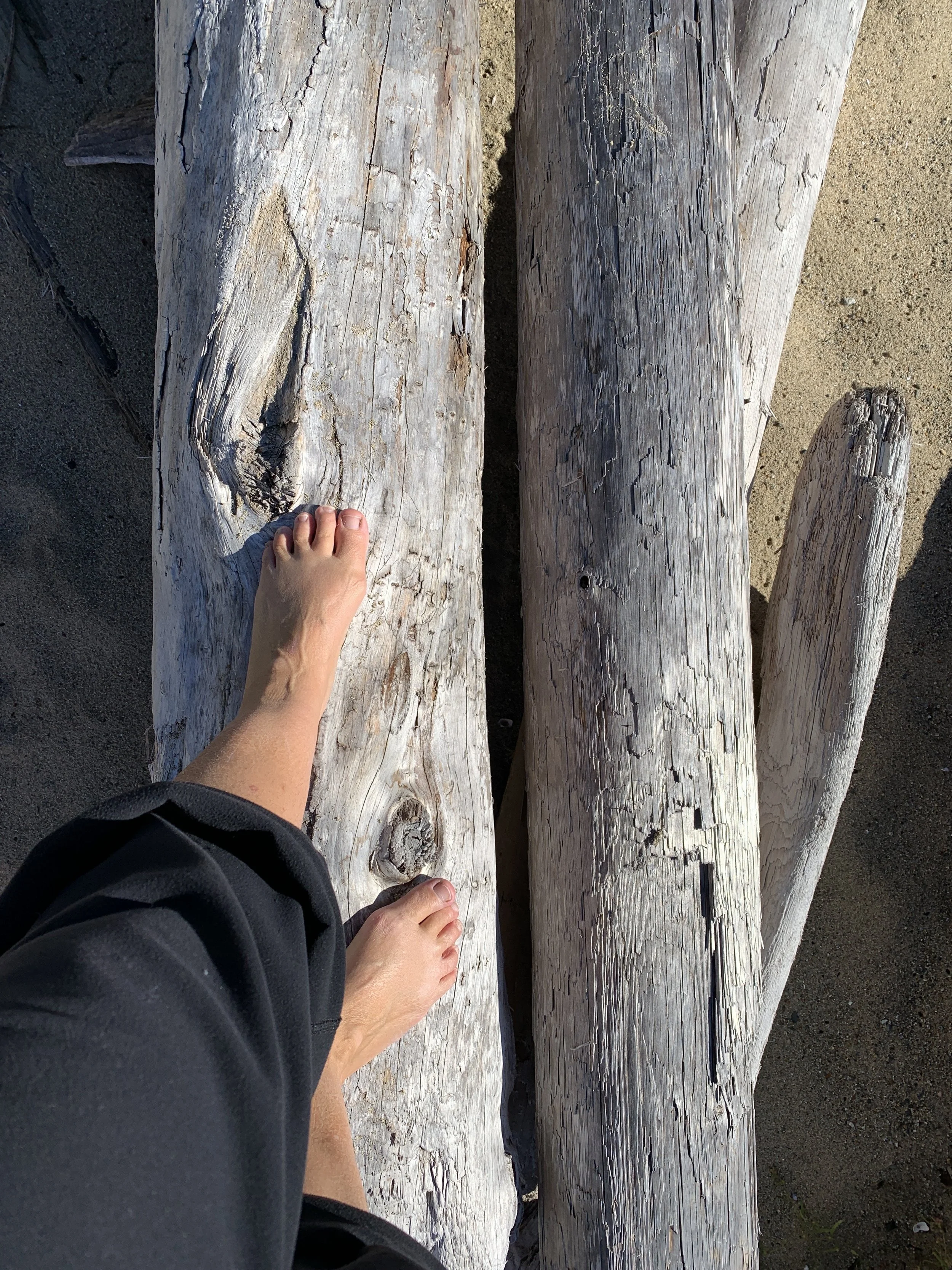 Although it’s Autumn here on B.C.’s West Coast once the sun comes out it’s still warm enough to remove our shoes and play on the beach driftwood! For me there’s no better feeling than tearing off my shoes and socks and gleefully exposing my feet to the Autumn air. I set myself up with a little game — how far can I make it along the piles of driftwood until I have to walk on the sand? It’s great for balance and dexterity of the feet right through to the somatic centre, the solar plexus.