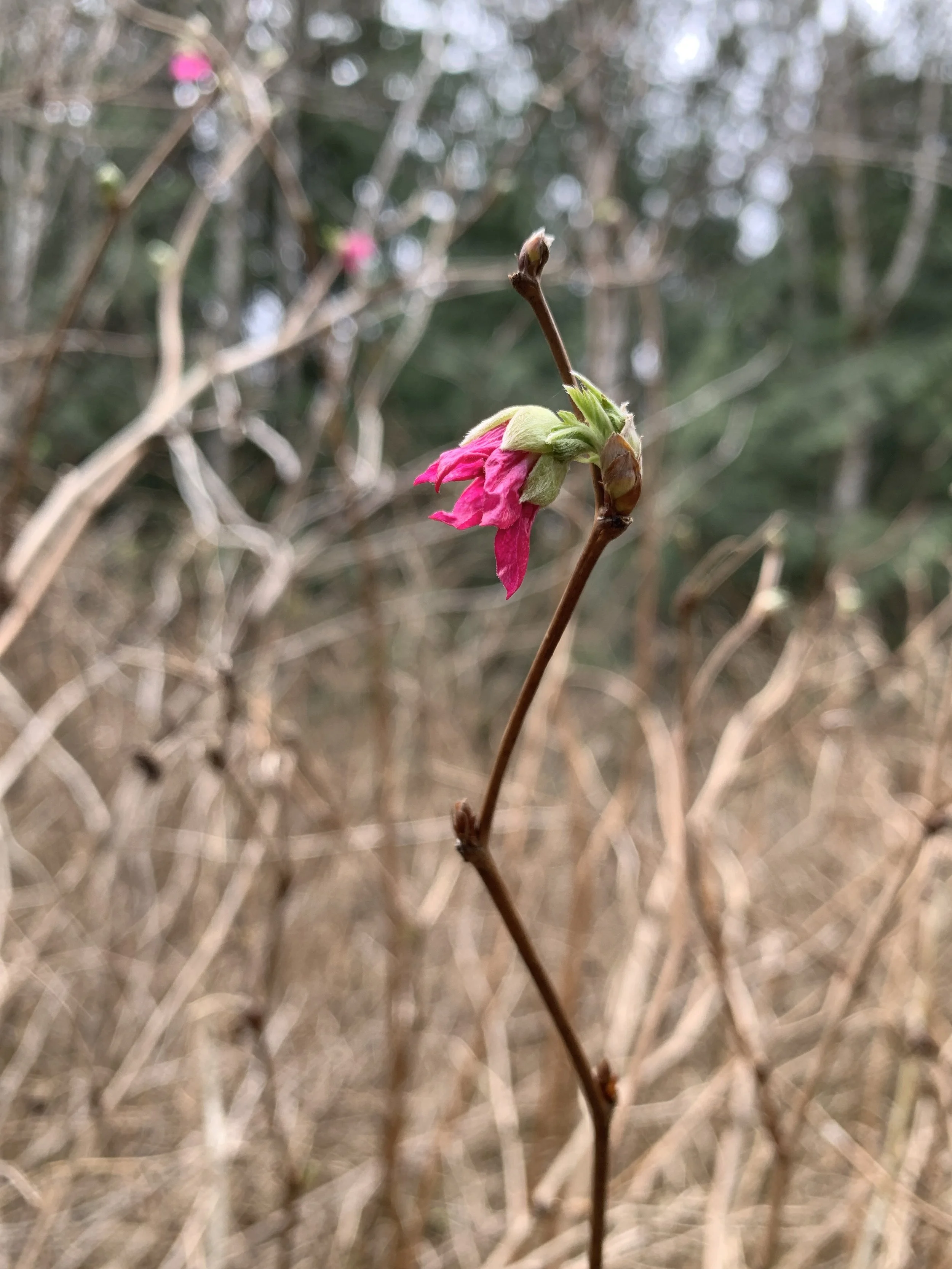 A Salmonberry flower slowly emerging. Haslam Lake, Powell River, B.C.